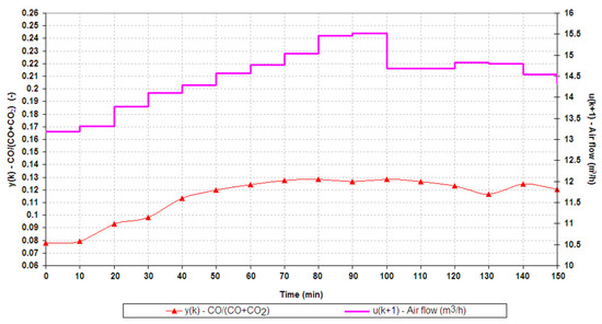 An alternative task of the extremal controller can be to control the airflow to achieve and to maintain the maximum value of the CO/(CO + CO) ratio. Figure 12 shows the CO/(CO + CO) ratio maximization behavior during the experiment with gasification. The extremal controller was tested during an experiment with gasification on the laboratory gasifier. The extreme was reached after 70 min from the start of the controller. Then, the controller increased the ratio to 0.125, and 120 min was maintained.