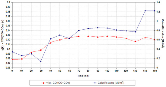 An example of a decreased ratio and calorific value is at the time of 135 h from ignition. At this time, it significantly reduces the maximum temperature. Research has shown that the CO/(CO + CO) ratio decreases with the increasing pressure of the oxidizer, and increases with increasing temperature. When searching for an extreme of this ratio, the aim is to find the maximum. Theoretically, the maximum value of the ratio is equal to the number 1. The increased value of this ratio represents a higher concentration of CO, and ultimately, a higher calorific value.