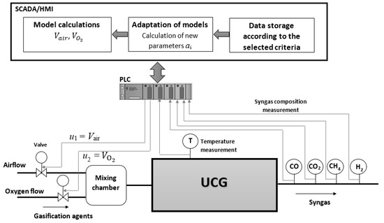 The nature of process information and the possibility of identifying UCG processes for their modeling determines the options for the design of the control system. The underground geo-reactor develops during the UCG (e.g., the movement of the combustion front, groundwater, cavity enlargement, etc.), which complicates the modeling of individual processes [28]. However, the UCG process is evolving, and underground conditions may change continuously. For this reason, it is necessary to constantly monitor the underground environment and to adapt to the operational parameters of the UCG [7].