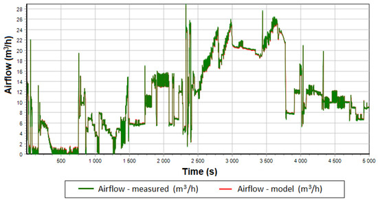 where represents the average value of the manipulation variable in the step k (m/h), calculated as t.j. as the average air flow elapses during . Furthermore, it is true that a . Parameter is the desired variable of ESC in the step (i.e., the new desired airflow) that enters the PI controller as a new setpoint (m/h) (see Figure 7). Parameter k is the time step, and is the increment of the desired value w. When initializing the algorithm, constant is empirically determined by the flow stabilization quality and .