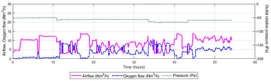 where refers to the desired airflow (m/h) or the servo valve opening that can be adjusted using a PI controller or directly via digital pulses; similarly, corresponds to the desired flow rate of oxygen injected to the oxidation mixture (m/h). Finally, the third control variable represents the regulated under-pressure on the outlet (Pa), equivalent to the frequency of the asynchronous motor power (Hz). Altering the motor power frequency causes changes in the ventilator’s speed, affecting the outlets under pressure (Pa).