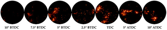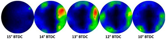 Visible images of combustion obtained through the piston crown window at 2000 rpm and at 700 bar of injection pressure are presented in Figure 3. This figure shows that for this engine operation, the HCCI process is reached. In addition, this figure shows small luminous spots randomly distributed at 10 CAD BTDC. As observed, these luminous spots are positioned in the boundary region. Over 10 CAD BTDC, the air motion moves these luminous spots over the entire cylinder volume during the compression stroke. In addition, from 10 CAD BTDC up to 10 CAD ATDC, the combustion behaves as premixed mode and the ignition does not take place in plainly homogeneous conditions.