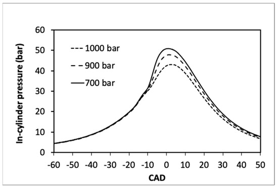 The experimental in-cylinder profiles with five early injections strategy at varying rail pressure when the engine speed is equal to 1000 rpm are reported in Figure 5. The inlet pressure is set equal to atmospheric pressure for this engine operation, whereas the inlet temperature was equal to 317 K. As observed on this figure, the highest in-cylinder pressure is achieved when the rail pressure is set equal to 700 bar and the lowest is obtained at 1000 bar of rail pressure. These slight pressure differences are due to fuel impingement observed experimentally when the injection pressure becomes higher than 700 bar (details are given in reference [21]). The impingement fuel mass does not take part in the combustion process and remains as unburned hydrocarbons. Figure 5 indicates, equally, that autoignition is not affected by the amount of impinged fuel mass and occurs for all strategies around 22 CAD BTDC for the first stage ignition (low temperature regime) and the combustion happens exclusively in a premixed mode.