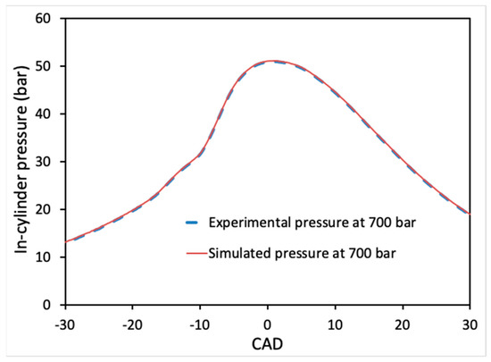 Comparison of the calculated in-cylinder pressure versus CAD with measured data at 1000 rpm and 700 bar.