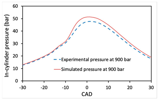 Comparison of the calculated in-cylinder pressure versus CAD with measured data at 1000 rpm and 900 bar.