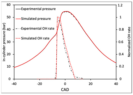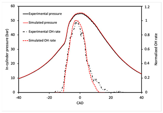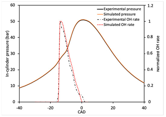 As an example, the measured OH rate profile is shown in Figure 8 when the engine speed is equal to 1500 rpm and the injection pressure set at 700 bar. This figure points out that the OH rate evolves during the high temperature regime and the increase in OH radical amount occurs at the same time than the main ignition. The qualitative comparison of measured and calculated OH rates during the main ignition for the same engine operation are shown in Figure 9. As observed in this figure the simulated OH rate profile has the same shape as the measured OH trace and the main ignition occurs at the same time. Moreover, the simulated OH rate evolves also during the high temperature regime as observed experimentally. This OH evolution shape has been observed experimentally by Collin et al. [33], where the OH radical has been measured by Laser Induced Fluorescence (LIF) at the wavelength of 283 nm. However, the authors have found that the OH-LIF intensity was lagging the main ignition time by about 8 CAD, which is not the case in the present study. This difference may be explained by the early small injections strategy reported in Table 2 and adopted in this study. Figure 9 also reproduces the comparison of measured and of simulated in-cylinder pressure profiles. As observed on this figure, the ignition delay time and maximum peak pressure are well reproduced by the model for this engine operating point.