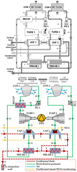 Yearly average data are indexed in Table 1 according to the line/state numbers stated in Figure 1. In the reference (dead) state condition, the temperature and pressure are assumed to be 18 °C and 1 atm, respectively. In the plant, the artesian geothermal fluid obtained from the production wells is separated into two phases as steam (saturated steam) and brine (saturated liquid) from the vertical separator at the wellhead (not shown in Figure 1). When Figure 1 and Table 1 are examined, the steam state at 165 °C temperature and 8.33 kg/s flow rate (line 1′) and the liquid state at 165 °C and 445 kg/s (line 1) are obtained for 1040 kPa high pressure from the separators. The liquid geothermal fluid is initially pressed into the VAP 1 in the high-pressure line, thereby heating n-pentane. The geothermal fluid, whose duty is completed, reaches the VAP 2 in the low-pressure line at 136 °C and 730 kPa (line 2), and n-pentane is again heated. In addition, steam geothermal fluid is supplied to VAP 2. After VAP 2 (line 3), to preheat n-pentane, the liquid geothermal fluid is sent to the preheaters (PRE-HEs 1 and 2) (lines 4 and 5). Some of the rotten steam is stored as NCG (line 10) and the rest is re-injected into the reinjection well by condensing at 85 °C and 590 kPa (line 9).