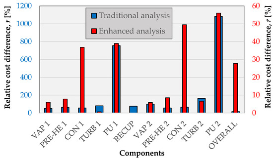 Figure 3 shows the relative cost difference for the plant and its components for the TradExEcon and AdvExEcon analyses. The relative cost difference (rk) is related to the increase in cost per unit exergy between fuel and product. As seen in Figure 3, while the rk value of the PP is 16% in the TradExEcon analysis, its value is 28% in the further analysis. The cost increase is provided between fuel and production with AdvExEcon analysis. However, this situation occurs by decreasing the rk value in the components. According to the TradExEcon analysis, the rk values of the pumps (754% and 1083% for PUs 1 and 2, respectively) are very high compared to the other equipment. For AdvExEcon analysis, their values are reduced to 39% and 56%, respectively. It shows that the exergy in these components should be improved by reducing the cost of demolition. After these components comes TURB 2 with rk values of 164%, followed by VAP 2 with 99%. However, with further analysis, the rk values are 7% for TURB 2 and 11% for VAP 2. For AdvExEcon analysis, the highest rk values among the components belong to PU 2 with 56%. It is followed by CON 2 with 50%, PU 1 with 39%, and CON 1 with 37%.