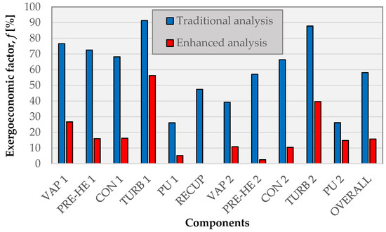 The exergoeconomic factor (fk) relates to the ratio of capital investment cost to total operating cost. In Figure 4, the variation in the exergoeconomic factor for the system and components for both analyses is given. As seen in Figure 3, the exergoeconomic factor in Figure 4 takes low values in contrast to the high values of the relative cost difference. This ensures the efficiency of the component by reducing the cost of exergy destruction. The fk value of the plant is calculated as 58% for the TradExEcon analysis and 16% for the further analysis. The capital investment cost of the PP is considered to be higher than the cost of exergy destruction. In the AdvExEcon analysis, the fk value decreases with the preventable part of the exergy destruction cost caused by the components. Therefore, if the efficiency of the equipment is increased, it is understood that the decrease in the investment cost is justified. As seen in Figure 4, the highest exergoeconomic factor in the TradExEcon analysis is TURB 1 with 92%. It is followed by TURB 2 with 88%, VAP 1 with 77%, PRE-HE 1 with 73%, and CON 1 with 68%. With the AdvExEcon analysis, the exergoeconomic factor of all components falls below 50%. Therefore, the exergy destruction costs of the components become important. The largest exergoeconomic factor decrease occurs in PRE-HE 1, CON 2, and PRE-HE 2. Investment cost ratios within the total operating cost of all equipment are reduced.