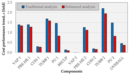 Cost performance trend (e), which is defined as the ratio of fuel exergy cost to production exergy cost, is presented in Figure 5 for both analyses. While the value of e is 0.45 times in the TradExEcon analysis, its value is 0.37 times in the enhanced exergy analysis. This result is due to a reduction in the fuel exergy cost. As shown in Figure 5, the “e” values of all components increase with further analysis. For the equipment with the highest e value, TURB 2 has a value of 2.2 times in the TradExEcon analysis, while its value in the AdvExEcon analysis decreases to 2 times. The biggest difference occurs in the pumps. Due to the high exergy destruction cost in the context of Figure 4, the change in the exergy destruction cost ratio (yk) is presented in Figure 6 for the system and components. The load of the whole system is calculated as 407% for the TradExEcon analysis and 125% for the AdvExEcon analysis. The exergy destruction cost in the total fuel exergy cost is reduced. A similar situation occurs within the components. As seen in Figure 6, condensers (CONs 2 and 1) and pumps (PUs 1 and 2) are the components that will make the highest contribution to the cost performance of the system. While the load value of PU 2 is 37% for the traditional analysis, it is 3% for the enhanced analysis. This contribution is obvious here.