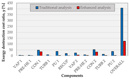 - The exergy destruction cost ratio (yk) was reduced from 407% with the TradExEcon analysis to 125% with the AdvExEcon analysis. Specifically, the value of PU 2 has been reduced from 37% to 3%.