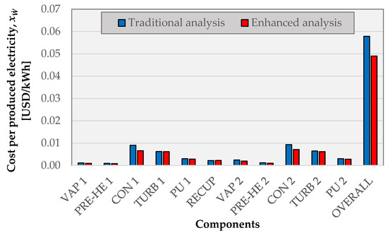 When comparing the results of both methods, Figure 7 shows the change (Xw) in the total operating cost per total electricity generation for the plant and its components. As seen in Figure 7, the total Xw value of the system is 0.058 USD/kWh and 0.049 USD/kWh for the TradExEcon and AdvExEcon analyses, respectively. With the application of the AdvExEcon analysis, there is a 15% reduction in the total operating cost of the PP. This is a result of the preventable portion of exergy demolition costs arising from the components.