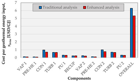For the condensers (CONs 2 and 1) with the highest total operating costs in Figure 2, the Xw values of the TradExEcon analysis in Figure 7 are equivalent to 0.009 USD/kWh. With the AdvExEcon analysis, these values are reduced to 0.007 USD/kWh. Again, the biggest difference in Xw for both analyses is in CONs 2 and 1. From here, it is clear that condensers are the most important contributor to the PP of the system. The change in cost (Xbrine) per energy of the geothermal fluid entering the PP is given in Figure 8. As seen in Figure 8, the Xbrine value of the system is 6.3 USD/GJ for the TradExEcon analysis. With the use of the AdvExEcon analysis, its value becomes 5.3 USD/GJ with a 15% decrease. It can be noted that a graphic similar to Figure 7 is created in Figure 8 and Figure 9. This is because the total operating cost is at a fixed value in all three ways.