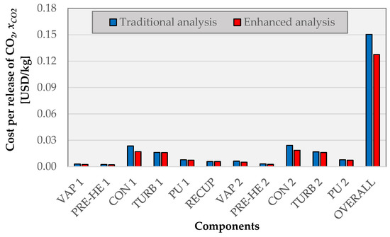 Figure 9 shows the change in cost per CO2 emission of the plant and components for the TradExEcon and AdvExEcon analyses. As seen in Figure 9, according to the TradExEcon analysis, the CO2 emission cost of the system is 0.15 USD/kg. This value can be reduced to about 0.13 USD/kg according to the AdvExEcon analysis. Considering that the cost rate per release of CO2 is a direct function of the output mass flow rate of the CO2, as the exergy destruction of the VAP 2 decreases, the cost rate per release of CO2 decreases. If the plant can be operated under operating conditions decided for the AdvEx-based analysis, the CO2 emission cost can be reduced by 15%. In particular, the condensers’ contribution to the CO2 emission cost of the plant is very high. From the economic and environmental point of view, it is concluded that condensers have priority for improvement.