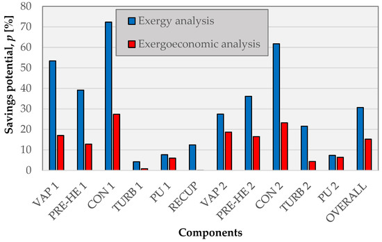 The savings potential (pk) for the system and components with the AdvEx-based analysis is presented in Figure 10. While the pk value of the system is 31% for exergy analysis, its value is determined as 15% for exergy analysis. The proportion of the preventable endogenous part in the total exergy breakdown of the components is higher than the ratio of the preventable endogenous part to the total operating cost. Therefore, it would be more advantageous to reduce the exergy destruction amounts of the components rather than their capital investment costs. In other words, it focuses on methods to enhance the performance of the components. As an example, the savings potential of CON 1 for exergy and exergy economics can be understood from the fact that they are 72% and 27%, respectively. As seen in Figure 10, performance improvement for CON 1, CON 2, VAP 1, PRE-HE 1, and PRE-HE 2 components indicates that they are priority components. In another aspect, it is important to reduce the total operating costs of the CON 1, CON 2, VAP 2, VAP 1, and PRE-HE 2 components.