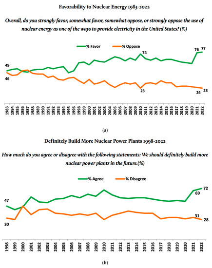 (a). Trends for support and opposition to nuclear energy among Americans from 1983 to 2022: Annual averages percentage—Based on data from [133,134,135]. (b). Trends for support and opposition to the construction of new nuclear power plants among Americans from 1998 to 2022: Annual averages percentage—Based on data from [135].