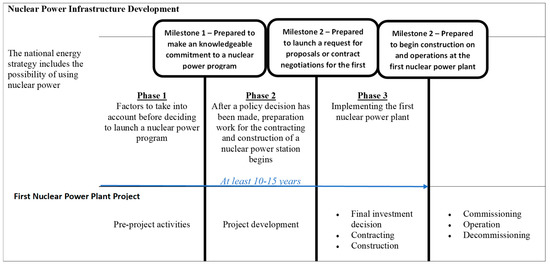 The IAEA has produced a plan for developing a nuclear power program’s infrastructure. This milestones method, depicted in Figure 3, was devised to give the Member States “guideposts” to indicate their progress during the planning stages and to show national and international stakeholders their commitment to nuclear safety and control. A nuclear power program’s infrastructure contains aspects for safe, responsible, and sustainable use of nuclear technology [52].
