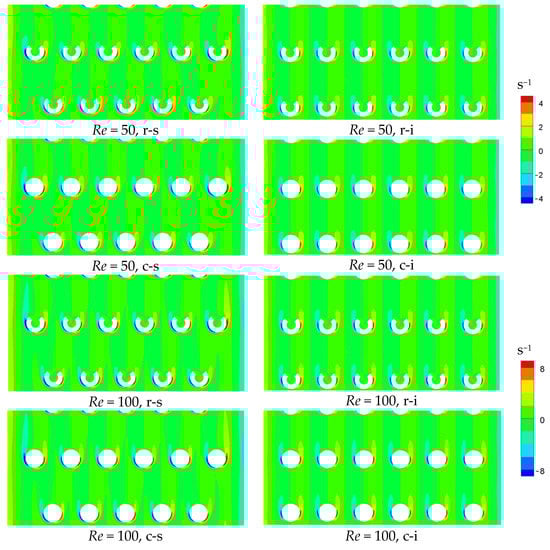 - High vorticity regions appear on two sides of the pin-fins, with similar intensity and opposite direction. With the increase of Re, the vorticity intensifies and diffuses further downstream but narrows in width.