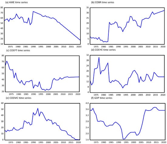Table 1 presents the study variables. Data from 1971 to 2021 on agricultural methane emissions (AME), carbon emissions from residential buildings and commercial and public services (COBR), carbon emissions from heat and electricity (COEHE), carbon emissions from manufacturing industries and construction (COEMC), carbon emissions from transport (COEFT), and gross domestic product (GDP) and Nitrous oxide emissions in the energy sector (NOEES) have been used. Except for the GDP data from International Energy Agency (IEA), the other variables are sourced from Word Bank data. GDP is expressed in billion 2010 USD using exchange rates, AME is expressed in the percentage of total methane emissions, and NOEES is expressed in the percentage of total nitrous oxide from the energy sector, while COEFT, COBR, COEMC, and COEHE are expressed in the percentage of carbon emissions from total fuel combustion. The data spread over a 51-year-old period.