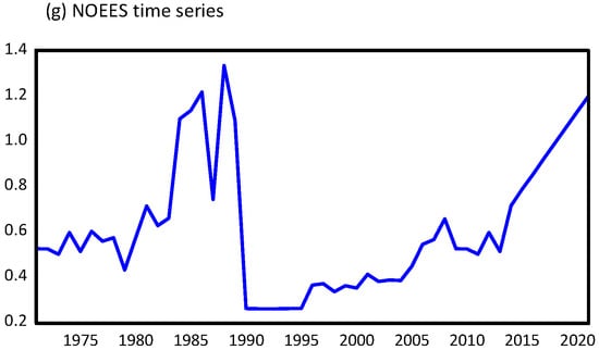 where represents the coefficient of error correction term, is the first difference operator, is the error term. , , , , , and are the short-term dynamic coefficients, while , , , , , and are long-term coefficients. is the drift component. A significant negative value of depicts a long-term association with the dependent variable and can be used to determine the adjustment speed to equilibrium [70]. An adjustment speed exceeding 0.5 denotes a quick adjustment to equilibrium, while a value less than 0.5 means a slow adjustment.
