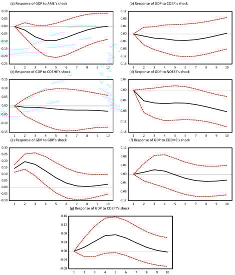 We ascertain that a standard deviation shock to AME hurts GDP in the short and long terms (Figure 3a). GDP will decrease from 2023 to 2026, hit its steady state value from the 4th to 5th period (2026 to 2027), and then increase till 2032. Similarly, a standard deviation shock to COBR, COEHE, and NOEES hurts GDP (Figure 3b–d). However, with a shock to COBR, GDP will start increasing from the 6th period (2027). Although a standard deviation shock to GDP positively impacts GDP, it may cause, at first, a minor rise from the 1st period to the 2nd (2022 to 2023), a decrease from the 2nd period to the 8th period (2023 to 2029), and then a rise again (Figure 3e). A standard deviation shock to COEMC has an asymmetric effect on GDP, positive from the 1st to the 5th period (2022 to 2026) and negative after 2026 (Figure 3f). GDP will start decreasing just after the 3rd period (2024), enter the negative region from the 5th period (2026), and remain in the negative region. A standard deviation shock from COEFT maintains the GDP in the positive region till the 9th period (2031) and start decreasing just after (Figure 3g).