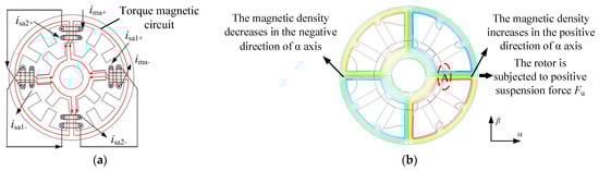 Nevertheless, according to the finite element simulation results, when the torque windings of phase A and the suspension windings in +α direction are energized at the same time, the generated magnetic flux paths are not completely independent of each other. As shown in Figure 7c, the magnetic force lines generated by the torque and suspension force are interwoven when the torque and suspension windings are excited simultaneously. Therefore, the torque and suspension force affect each other, and the decoupling of this structure is not completely realized.