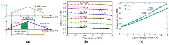 (a) Ideal inductance curve, torque and suspension force curves; (b) Torque curves; and (c) Variation curves of suspension force.