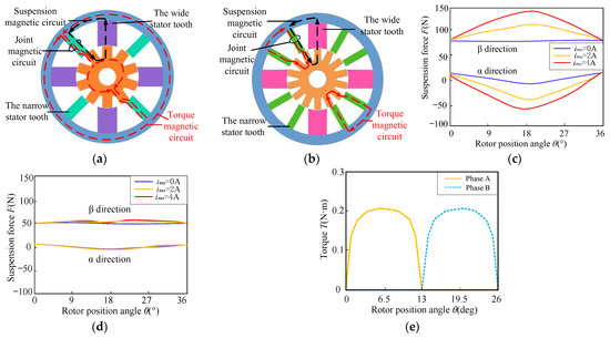 In light of the coupling between torque and suspension force, an 8/10 hybrid stator BSRM [14,15] (Appendix A) is proposed by Kyungsung University in South Korea. As shown in Figure 3a, wide stator teeth generate suspension force while narrow stator teeth generate torque, which means the torque and suspension pole are independent of each other. The windings on each pair of torque poles form a phase in series, while the windings on the four suspension poles are controlled independently. Due to advantages such as capability of independent control for each phase and three switching modes, an asymmetric converter is applied in the 8/10 hybrid stator BSRM. However, only four stator teeth generate torque in this structure, which are fewer than that of an ordinary BSRM generating torque. Therefore, the power density is low. Moreover, due to long magnetic circuit and few poles producing torque and suspension force, the torque current has a great influence on suspension force when the torque and suspension windings are excited simultaneously. To further improve motor performance, a 12/14 pole hybrid stator BSRM (Appendix A), the addition of the number of stator poles on the basis of the 8/10 pole hybrid stator BSRM is proposed in reference [16], as shown in Figure 3b. Compared with the 8/10 pole structure, the magnetic circuit is shortened in this structure, improving the power density. The core loss is effectively reduced, and the output torque is improved. Figure 3c,d, respectively, show the changing curves of suspension force F of the two hybrid stator tooth structures with the torque current ima. The suspension current isa is 2 A, and ima varies from 0 A to 2 A. It is noted from the two figures that ima of the 12/14 pole structure has little influence on F compared with that of the 8/10 structure. However, the power density is low, in that each stator tooth of the hybrid stator BSRM only generates torque or suspension force. In addition, the stator pole arc is the same as the rotor pole arc. The torque is very small or even zero during commutation due to the delay characteristics of current on the actual operation of the motor. The torque characteristic curve of the 12/14 pole BSRM is shown in Figure 3e. It is observed that there is a torque dead zone near the commutation position, which may lead to the disadvantages of large torque fluctuation. Since both motors are two-phase motors, the self-starting ability is weak.