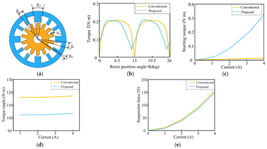 Due to the disadvantages of large torque fluctuation and weak self-starting ability of the conventional 12/14 BSRM, an asymmetric rotor pole hybrid stator BSRM (Appendix A) is proposed [17]. The only difference between a conventional 12/14 hybrid stator BSRM and the proposed structure is that the rotor pole surface of the proposed motor has a structure similar to a step. As shown in Figure 4a, βst is the pole arc of the torque pole, βsf is the pole arc of the suspension pole, βr is the pole arc of the asymmetric rotor pole, βrs is the step angle of the asymmetric rotor pole and hrs is the step height of the asymmetric rotor pole. Reference [17] finally concludes that the combination of βst = 11°, βr = 14° and βrs = 3° is the best, which means motor has smaller torque ripples and higher starting torque and average torque. Figure 4b–e show torque characteristics, starting torque, torque ripple and suspension force in conventional and proposed hybrid stator BSRMs. The proposed motor eliminates the torque dead zone, produces positive torque at any rotor position, improves the starting torque of the motor and reduces torque ripple. However, due to the asymmetric rotor pole, the average suspension force is slightly reduced compared with the conventional one.