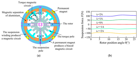 Permanent magnet biased hybrid stator BSRM: (a) Motor flux path and structure diagram; (b) Suspension force curve.