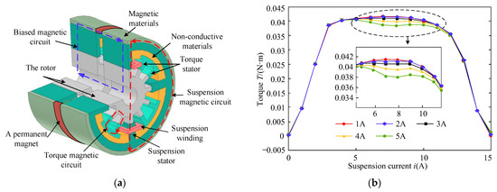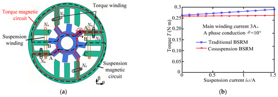 Co-suspension winding BSRM: (a) Motor structure; (b) Comparison of conventional BSRM torque and co-suspension BSRM torque.