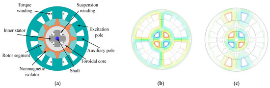 On the basis of the above conventional DSBSRM, a structure of a segmental rotor type 12/8 DSBSRM (Appendix A) [25] is proposed as shown in Figure 8a. The outer stator of the proposed structure is divided into two magnetic poles: excitation and auxiliary magnetic poles. Torque is produced by the torque windings, which wind around the excitation magnetic poles. The rotor is adopted as a non-salient structure and the nonmagnetic isolator is employed to achieve independence between torque and the suspension system. The suspension mechanism of the proposed DSBSRM is the same as that of a conventional DSBSRM. Figure 8b,c show magnetic flux distribution of a conventional 12/8 DSBSRM and segmental rotor type 12/8 DSBSRM, respectively, when phase A and all suspension windings are excited simultaneously. It is observed that the magnetic flux generated by torque and suspension winding passes the same rotor yoke in a conventional 12/8 DSBSRM, while the magnetic flux generated by torque and suspension windings is independent from each other because of the nonmagnetic isolator in the segmental rotor type 12/8 DSBSRM. Therefore, the proposed structure reduces the coupling between torque and suspension force and improves the output torque density compared with that of a conventional 12/8 DSBSRM.