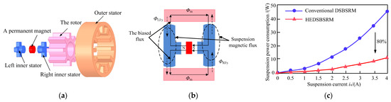 Axially magnetized double stator BSRM: (a) Motor topology diagram; (b) Biased magnetic circuit and control flux path; and (c) Suspension power consumption.