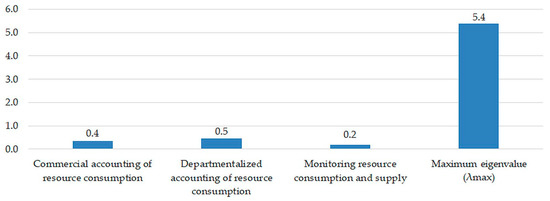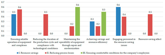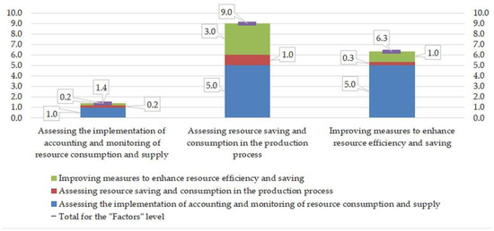 The main task of applying the AHP procedure was to identify the share of each criterion in the total volume, and evaluate the contribution of a separate event at each level to the overall goal of increasing the resource saving of an enterprise. For this, the significance coefficients were calculated to construct the corresponding matrix. The relative importance of the components of the hierarchy were determined using the nine-point scale of relationships developed by the authors. In accordance with the goal, the scale allows the decision maker to set numerical values for the preferred options from a range of 1 to 9, compared to others located at a higher level of the hierarchy. The scale includes two criteria: 1—“objects are equivalent”, value one is assigned; 2—“object is more preferable”, value two is assigned. Figure 3 shows the degree of influence of each “factor” in relation to the “Focus” level in the overall assessment of the efficient use of company resources.
