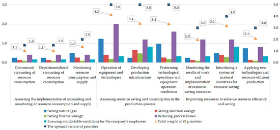 The “Contrasting Priority Scenarios” level reflected the main results obtained from the implementation of activities at the level of “Actors’ Targets” (Table 3). “General Priority Scenario” was the sixth and final level in the hierarchy we considered. It includes the main elements of resource-saving economic effect: 1. Resource savings: natural gas, power and thermal energy; 2. Reducing process losses; 3. Ensuring comfortable conditions for the company’s employees.