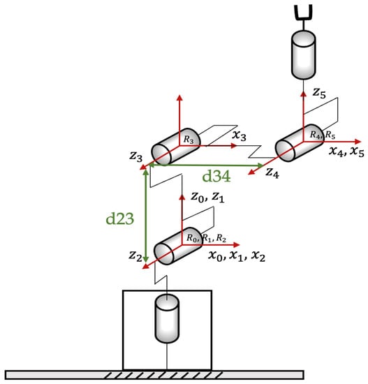 To ensure convenient computation during the forward and inverse kinematics processes, it is recommended to align the three axes (R0, R1, R2) and the two axes (R4, R5); this is illustrated in Figure 3.
