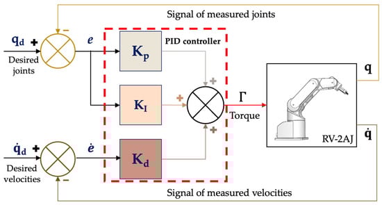 The robot arm’s dynamic model consists of n second-order nonlinear and coupled differential equations, where n represents the number of joints. In the traditional control theory, the robot dynamic was assumed to be a linear model, where every joint was controlled by a decentralized PID controller. The advantages of this approach are the low computational time and the ease of applicability. At the same time, it can result in poor tracking accuracy and setpoint overruns during rapid movements, as well as temporal response variations depending on the robot’s configuration. Nonetheless, in many practical applications, these limitations are not significant issues. Figure 4 depicts the command scheme for this approach.