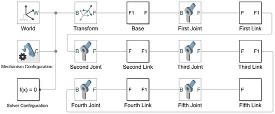 In order to simulate and control the motion of the RV-2AJ robot arm in the case of the application of both the PID and the MPC controllers in MATLAB 2022 software, both of the previously dedicated computations should be performed. In our research, the focus is mainly on calculating the forward and inverse kinematics beside the Jacobian matrix. The dynamic model used for the RV-2AJ robot arm is presented as a CAD model created by SolidWorks software. SolidWorks can provide us with the ability to generate the inertia matrix automatically for various mechanical body structures, e.g., for the RV-2AJ robot arm. Additionally, the software enables us to import the entire mechanical body structure into the Simscape body toolbox of MATLAB software, which is a powerful tool that allows us to calculate the torques of the joints.