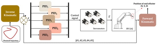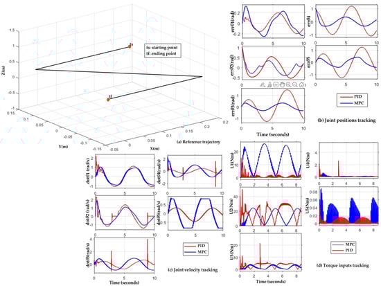 The first part (Section 3.1) of this paper focuses on the detailed methodology relating to the mathematical background of the operation of the RV-2AJ robot arm in order to identify the three mathematical models of the RV-2AJ robot arm: (1) kinematic, (2) Jacobian, and (3) dynamic. We focused on the kinematic model, which is needed to control the desired reference trajectory, where the third model, the “dynamic model”, is needed to simulate the robot arm’s behavior and to build the controllers. The second part (Section 3.2) explains the theoretical backgrounds of both the PID and the linear MPC controllers.