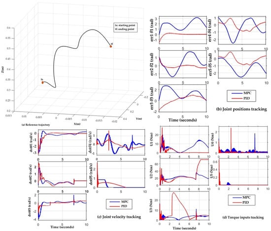 In the case study, the mathematical modeling and the control background of a 5 DOF RV-2AJ robotic arm were described. The development of the PID and MPC controllers was explained step by step. The simulation of both controllers was made in MATLAB Simulink based on the dynamic structure of the RV-2AJ robot arm in the Simscape Multibody toolbox. Three reference trajectories were generated and implemented to analyze the performance of both controllers in order to define the optimal one. Three parameters were simulated: the average of the control torque (Δu); the tracking trajectory precision (); and the cycle execution time (ExTime).