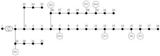 In this section, a modified IEEE 33-node distribution system is taken as a case study to verify the feasibility and effectiveness of the voltage control method proposed above. The system structure is shown in Figure 2. Regulation equipment such as WTs, PV systems, OLTCs, SVCs and capacitor banks were added, and the specific parameter configurations are shown in Table 1. The system voltage reference was set to 12.66 KV and the power reference was set to 10 MVA. The parameters of the case system refer to Ref. [30], and the line parameters are shown in Appendix A. The upper and lower limits of the node voltage were set to 1.05 p.u. and 0.95 p.u, respectively. In addition, the WT and PV systems were operated in a constant power factor mode, and the relevant parameter configurations are shown in Table 2.