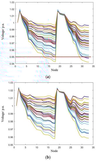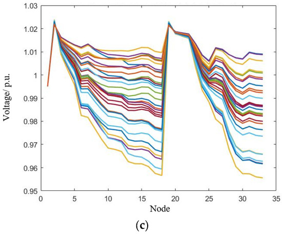 To verify the adaptability of the proposed hybrid-driven model to source–load uncertainty, 30 groups of source and load data were randomly generated to simulate actual source–load fluctuation scenarios, in accordance with the predicted data and prediction error coefficients in Section 5.1. In each scenario, the power flow calculations were performed based on the reactive power strategies solved by the three models. Figure 4 and Figure 5 show the voltage distribution and active power loss based on the power flow calculation, respectively. Different colors represent different simulation scenarios.