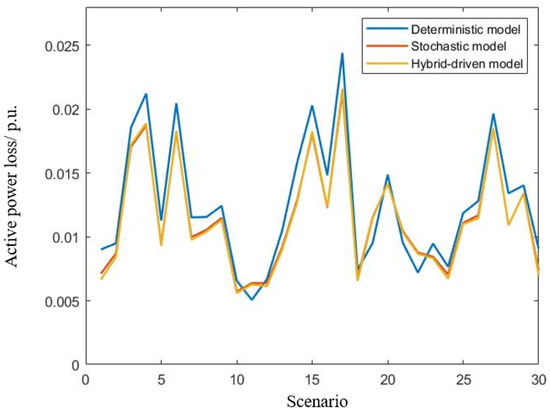 - In most scenarios, the active power loss values corresponding to both the stochastic model and hybrid-driven model were smaller than those of the deterministic model. However, in some scenarios, such as scenario 11, scenario 19, scenario 21 and scenario 22, the deterministic optimization model performed better. Through further analysis, the simulated source and load data in these four scenarios were close to the predicted data, which shows that the deterministic optimization strategy based on the predicted data performed better.