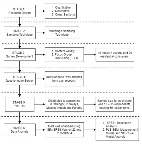 Research design can be defined as the set of frameworks and structures used for the purpose of conducting research where it is useful to collect and analyse data to answer the research questions and solve research problems [60]. In accordance with the research objective, this study employs (1) quantitative, (2) descriptive, and (3) cross-sectional research designs to investigate energy consumption based on the residential consumers’ lifestyles.