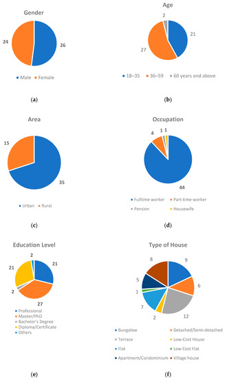 The study was conducted on 50 respondents, of whom 26 were male and 24 were female. As presented in Figure 2, the average age of the respondents was between 36 to 59 years old, with 27 respondents having a Master’s/Ph.D. degree. In terms of occupation, the majority of the respondents were full-time workers (44 respondents). As for the housing area, 35 of the respondents were from urban areas, and 15 respondents were from rural areas. Out of the eight types of houses analysed in the study: bungalow, terrace, semi-detached, low-cost house, flat house, low-cost flat house, apartment/condominium, and village house. The terrace house was the highest, as there were 12 respondents who lived in a terrace house.