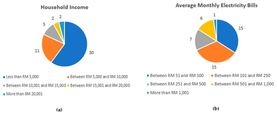 The focus of Figure 3 is on household income and average monthly electricity bills. A total of 30 respondents had a total household income of less than RM 5000. The average monthly electricity bills was between RM 51 and RM 100 for 15 respondents and between RM 101 and RM 250 for another 15 respondents.