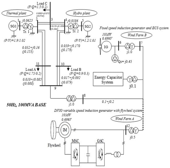Figure 1 shows the model system of study used in this paper, with the wind turbines modeled based on [37]. The steam (SG1) and hydro turbines (SG2) were rated at 25 and 20 MW, respectively, and connected to wind farms A and B. The wind turbines in the wind farms for both schemes were each rated at 10 MW. The parameters of all the turbines in the model system are given in Table 1 [37,38]. From Figure 1, both wind farms were connected to an existing grid network made up of steam and hydro turbines. The topology and control system of the flywheel DFIG-based system is shown in wind farm A. In this wind farm, three DFIG wind turbines of smaller capacities with the same wind speed were present; however, for simulation purposes, an aggregated wind turbine of a larger capacity of 10 MW was considered in this study. The DFIG flywheel-based system in wind farm A had a machine side converter (MSC) and grid side converter (GSC) that were tied to the induction machine (IM). Wind farm B was made of an SCIG fixed-speed wind generator system with an ECS connected to its terminal to achieve smoothing of the wind power during periods of dynamics or wind speed changes. An aggregated fixed-speed induction wind turbine was also considered in this wind farm for simulation purposes.