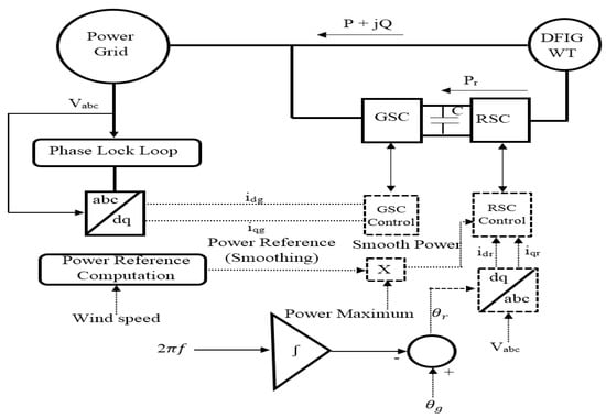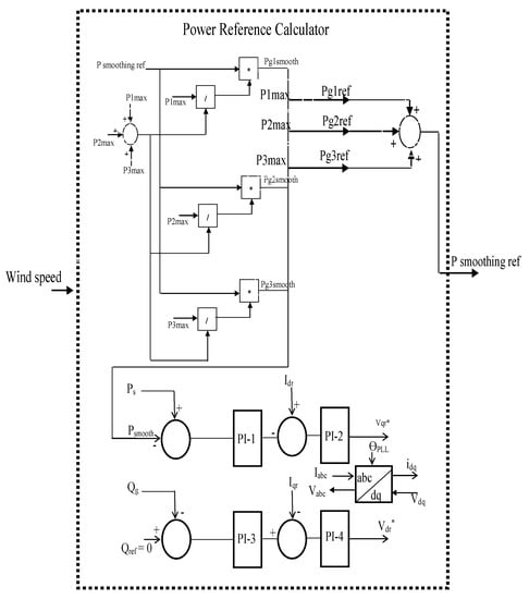Figure 2 shows the control scheme for wind farm A. Based on the detections of the grid voltage, the phase lock loop (PLL) angle is computed for abc to dq conversion and vice versa. The calculator for the reference power ensures the smoothing of the fluctuated wind power based on the available natural wind speed. The flywheel DFIG-based scheme is typically made of a high-inertia induction generator having power converters that are connected back-to-back. These power converters are known as the rotor or machine side converter (RSC or MSC) and stator or grid side converter (SSC) or (GSC). The direct and quadrature currents, idg and iqg, are used to regulate the DFIG with the turbine for the GSC power converter for control of reactive power injection and voltage. The currents idr and iqr are used to regulate the RSC power converter for the control of the active power of the wind generator. The Scheme 1 operating principle is such that the wind generator rotating mass would be able to store and retrieve energy during dynamic operation. The flywheel scheme based on a wind generator has excess stored kinetic energy expressed as [40]