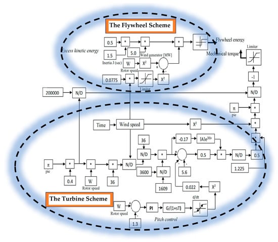 where and are the maximum and minimum speeds of the flywheel system, respectively. Regarding the electrical aspect of the system, the stator circuit power exchange and the electrical torque of the wind generator are given as [41,42]
