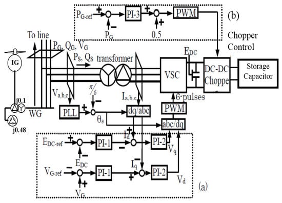 Figure 5 shows the control scheme for the ECS connected to the terminal of the fixed-speed SCIG. The PLL angle theta is used for the dq to abc transformation. The measured voltage and its reference are compared, then the proportional integral (PI) controller system is used to obtain their controlled signal. The generated resultant signal is matched with a signal generator to develop the IGBT pulse references. These reference-controlled variables are used to operate the ECS unit in order to control the wind farm in particular and the entire power network in general during dynamics. There exists a low pass filter (LPF) that is incorporated in the ECS scheme, as shown for DC–DC chopper circuitry. The reference signals for the LPF are the active powers of the grid and the wind generator. A PI controller helps control an output signal in conjuncture with a constant gain to generate a resultant signal, comparable with a triangular carrier signal generator. The DC–DC chopper for charging and discharging constraints is thus operated based on the resultant output signal.